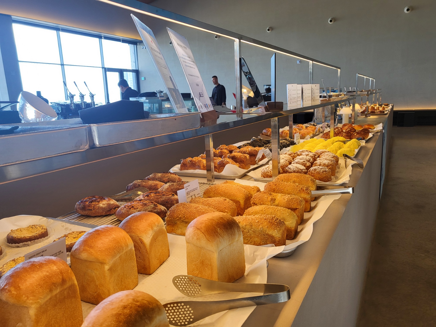 내부는 생각보다 더 넓은 구조입니다. 중앙에 베이커리 판매대와 주문하는 곳이 있습니다. 베이커리 종류가 꽤 다양해서 살짝 선택 장애가 옵니다. ㅎㅎ