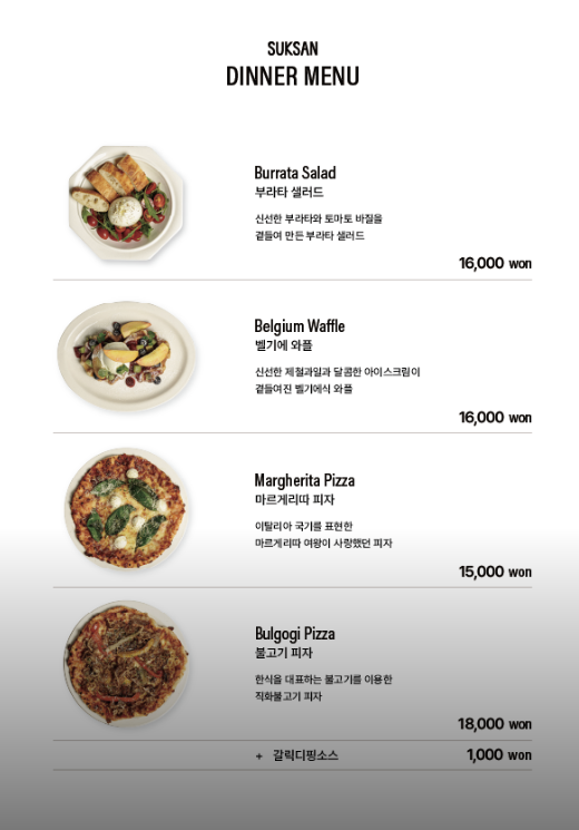 석산은 까페로만 즐기는 공간이 아니라 올타임 즐길 수 있는 곳으로 브런치 메뉴와 디너메뉴가 따로 있습니다.