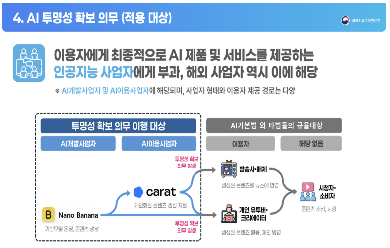 - 생성형 AI: AI 생성 콘텐츠에 'AI 생성물' 표시 의무 (워터마크나 문구). 딥페이크 같은 오용 방지 목적.