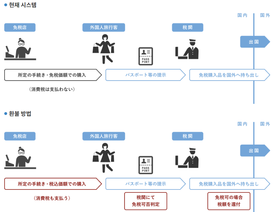 - 변경 내용: 환급 제도(Refunds 방식)로 전환합니다. 세부 절차는 다음과 같습니다. ① 매장에서 물건을 살 때 소비세(10%)를 포함한 전액을 결제합니다. ② 출국 시 공항/항만 세관에서 구입한 물품을 확인받습니다. ③ 확인이 완료되면 신용카드나 전자결제 등으로 세금을 환급받습니다.