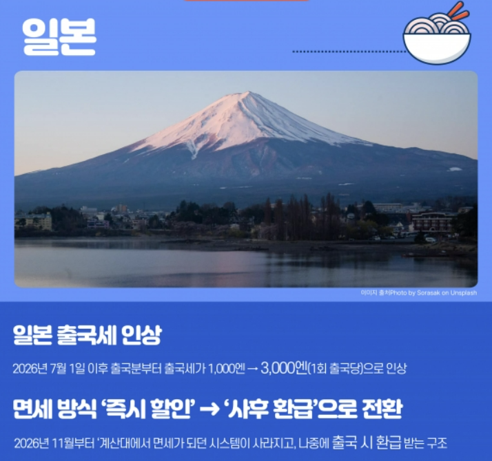 최근 일본 정부가 오버투어리즘대응과 세수 확보를 위해 여행 관련 제도들을 대대적으로 개편하고 있습니다. 특히 출국세 인상, 숙박세 강화, 면세 쇼핑 제도 환급 방식 전환이 대표적입니다. 이번 포스트에서는 일본 여행을 계획 중이신 분들을 위해 2026년부터 시행되는 일본의 주요 관광 관련 세제 변경 사항에 대해 알아보도록 하겠습니다.